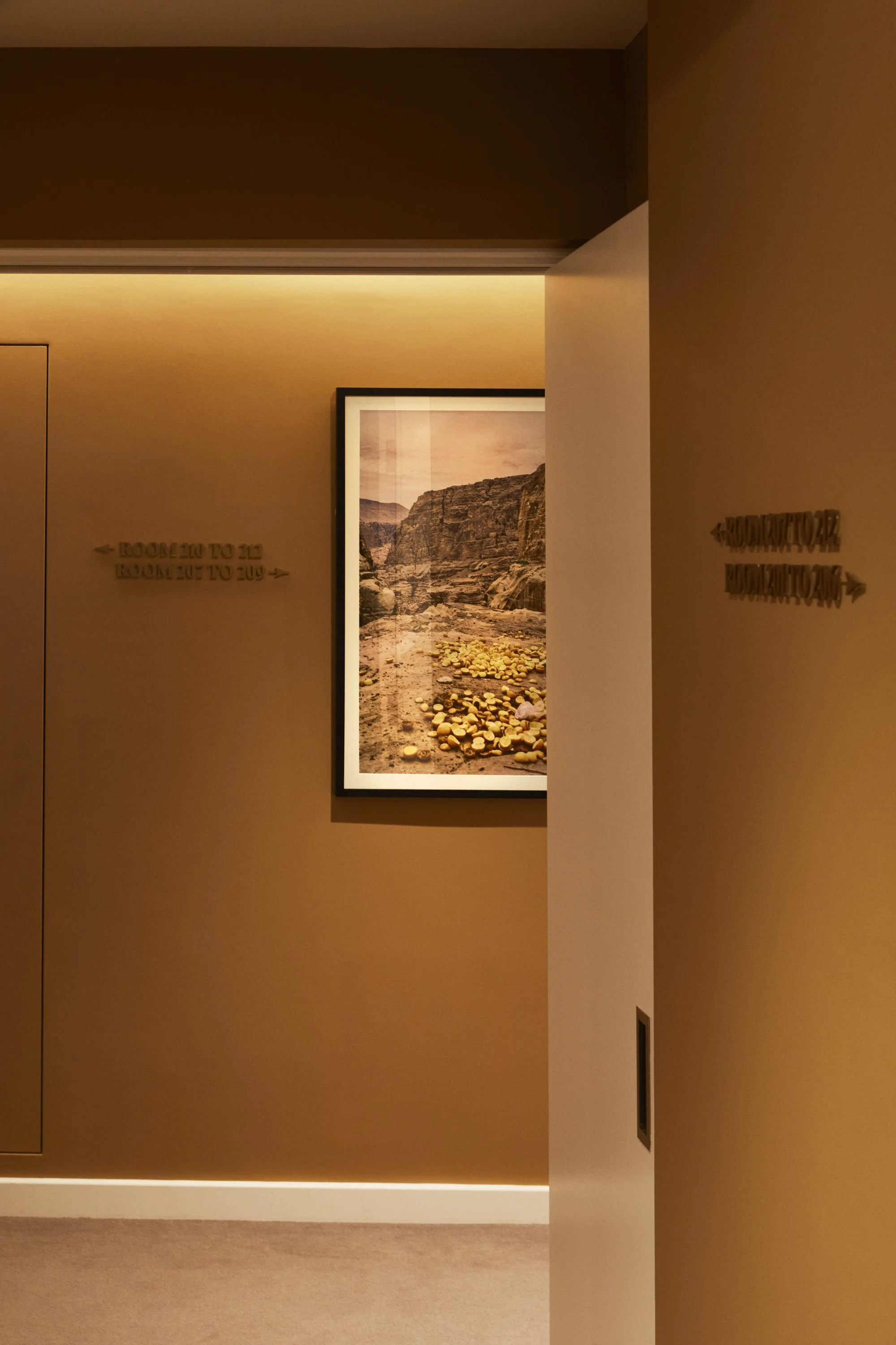 Working within a commercial budget, our focus was on sourcing robust, modern furniture and affordable artwork that could still offer character and resonance. Each room type was given subtle individuality, while the communal areas were animated through ochre-yellow corridors, large-scale artworks and custom rugs – moments of warmth and identity that anchor the guest experience.